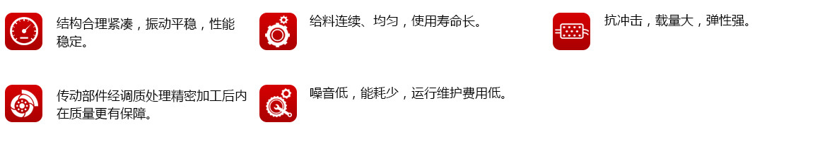 工作时通过电机驱动,使皮带槽联轴器带动偏心轴旋转,从而产生巨大的激振力,使机体在支承弹簧上作强制振动,物料则以此振动主动力,在15°料槽上作滑动及抛掷运动,从而使物料前移而达到给料目的。